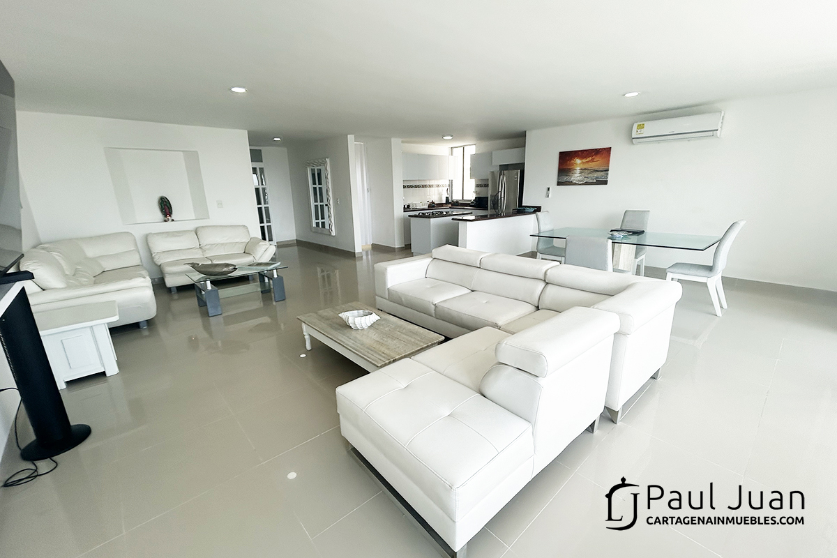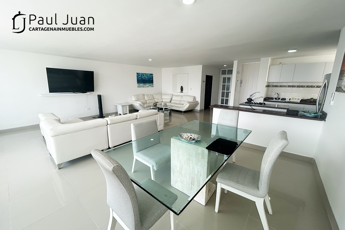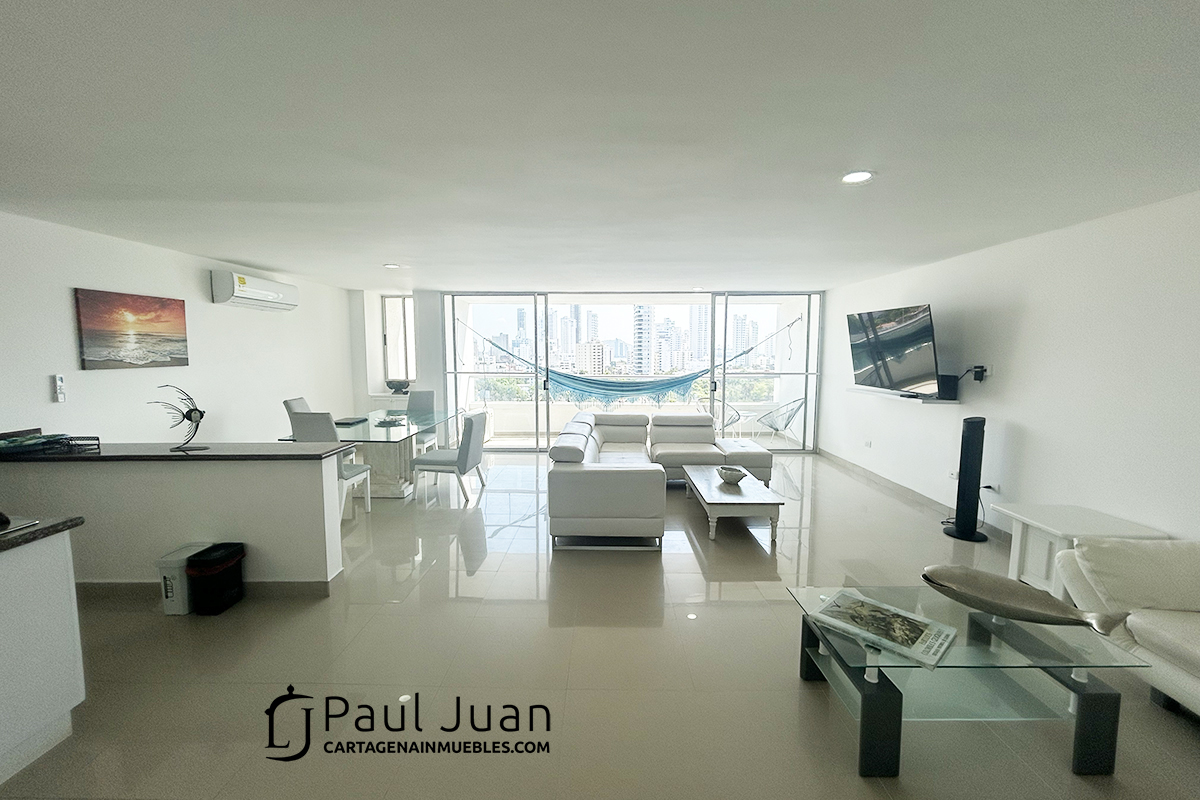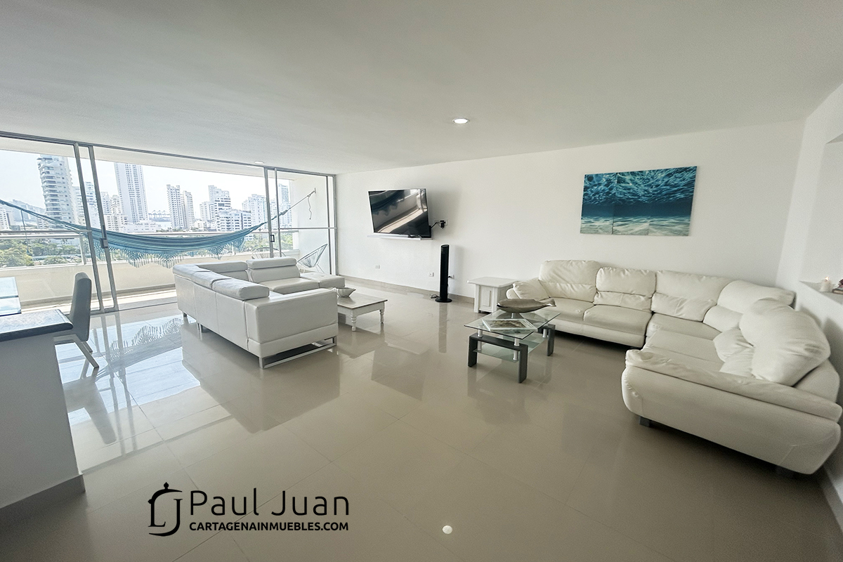 Espacioso apartamento de tres alcobas recien renovado, con espectacular vista al Laguito y Bocagrande. Tiene sala, comedor, tres habitaciones, dos baños y medio, cocina, gran balcón, zona de ropas, cuarto y baño de servicio. Residencial. Se ofrece amoblado.