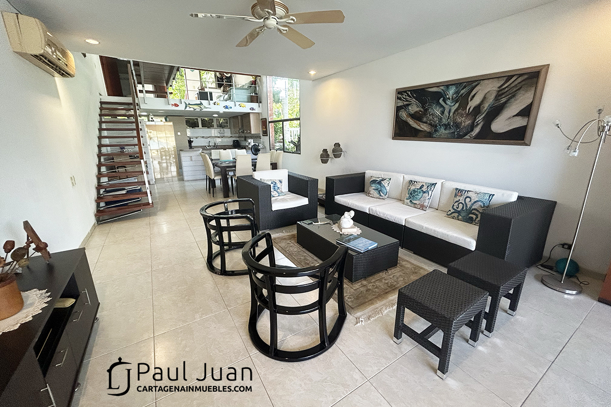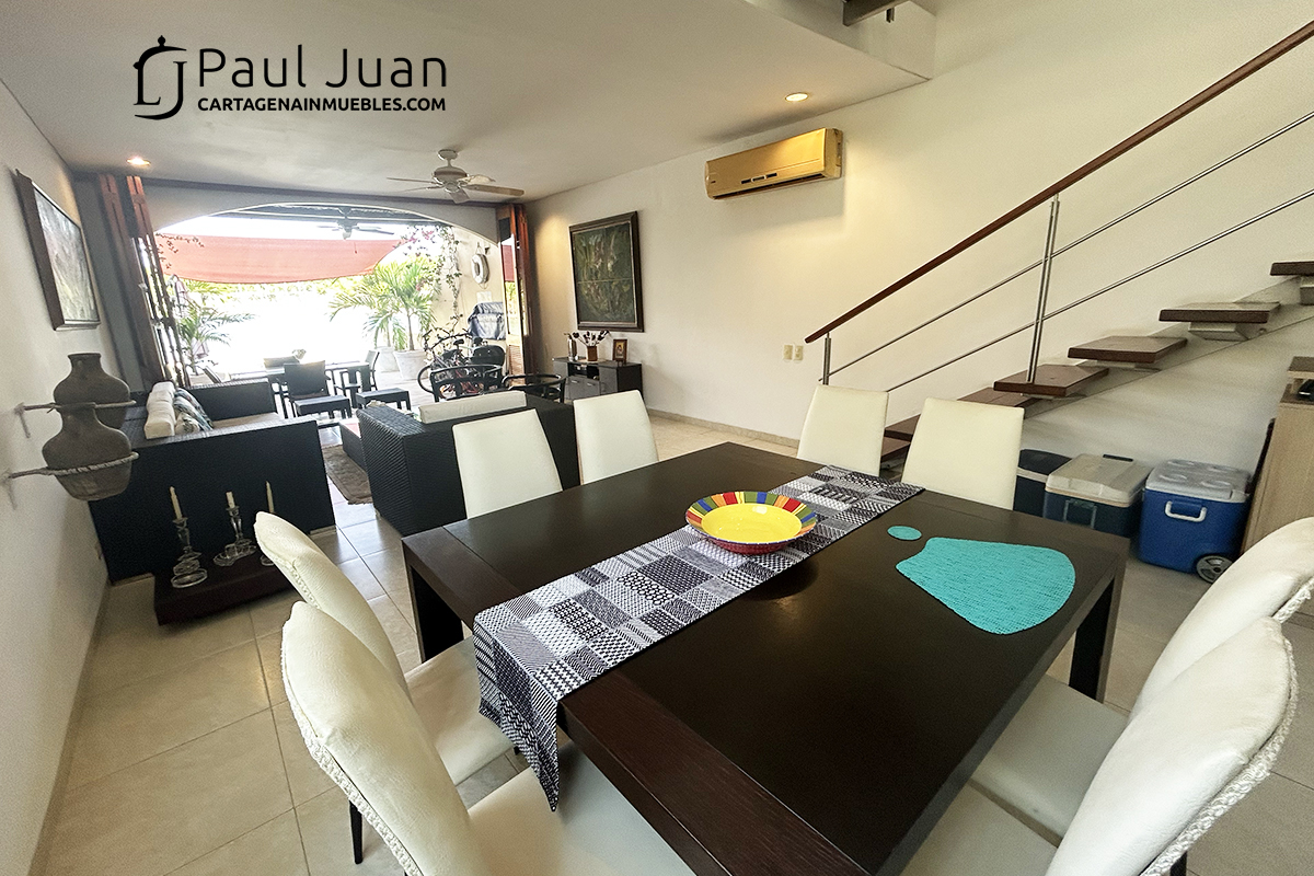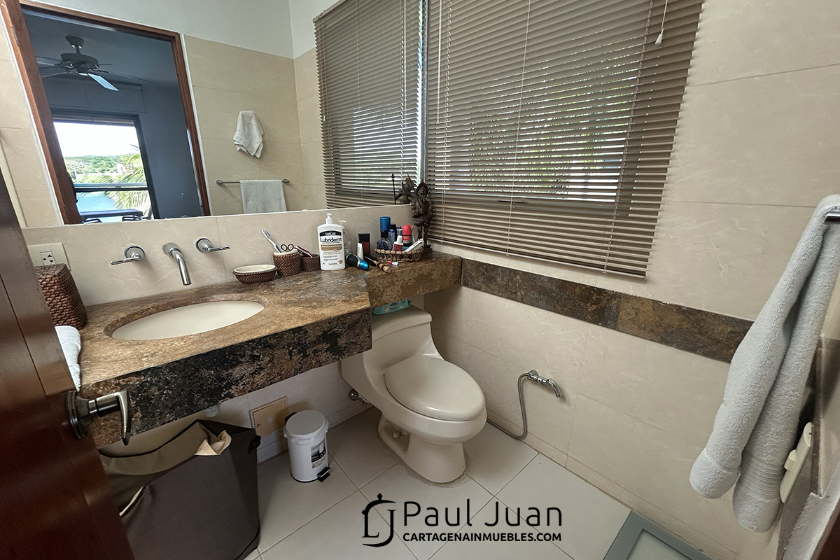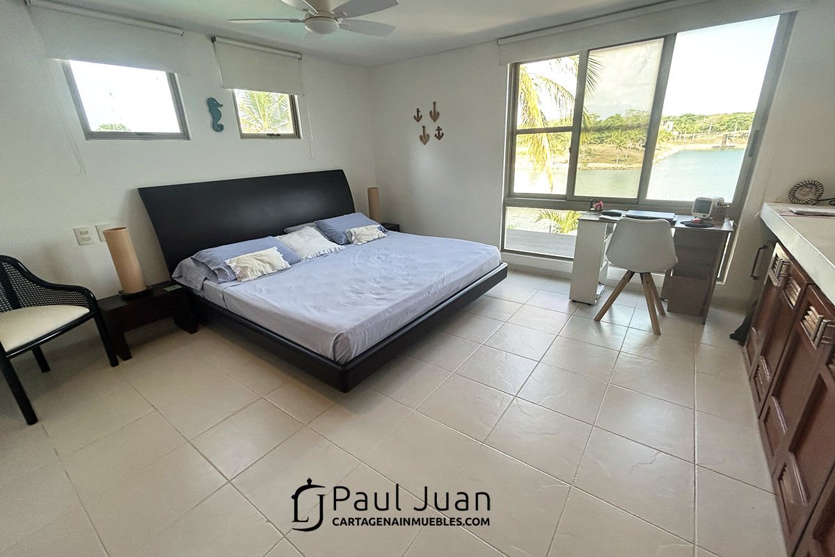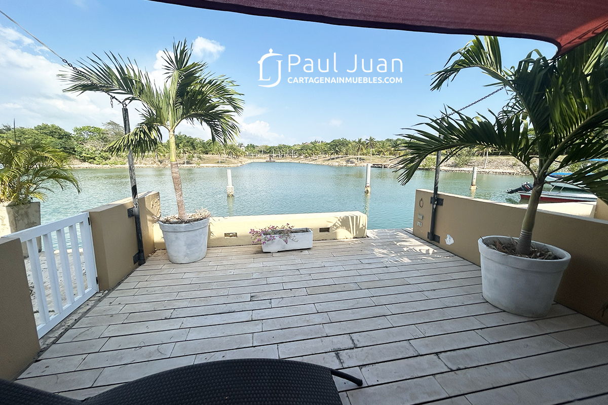 Fabulosa casa náutica con muelle propio, en venta, dentro del Condominio Marina de Barú. Tiene Tres habitaciones, cada una con baño, baño social, sala, comedor, cocina, zona de labores y una gran terraza frente al agua. Se vende amoblada excepto las piezas de arte.