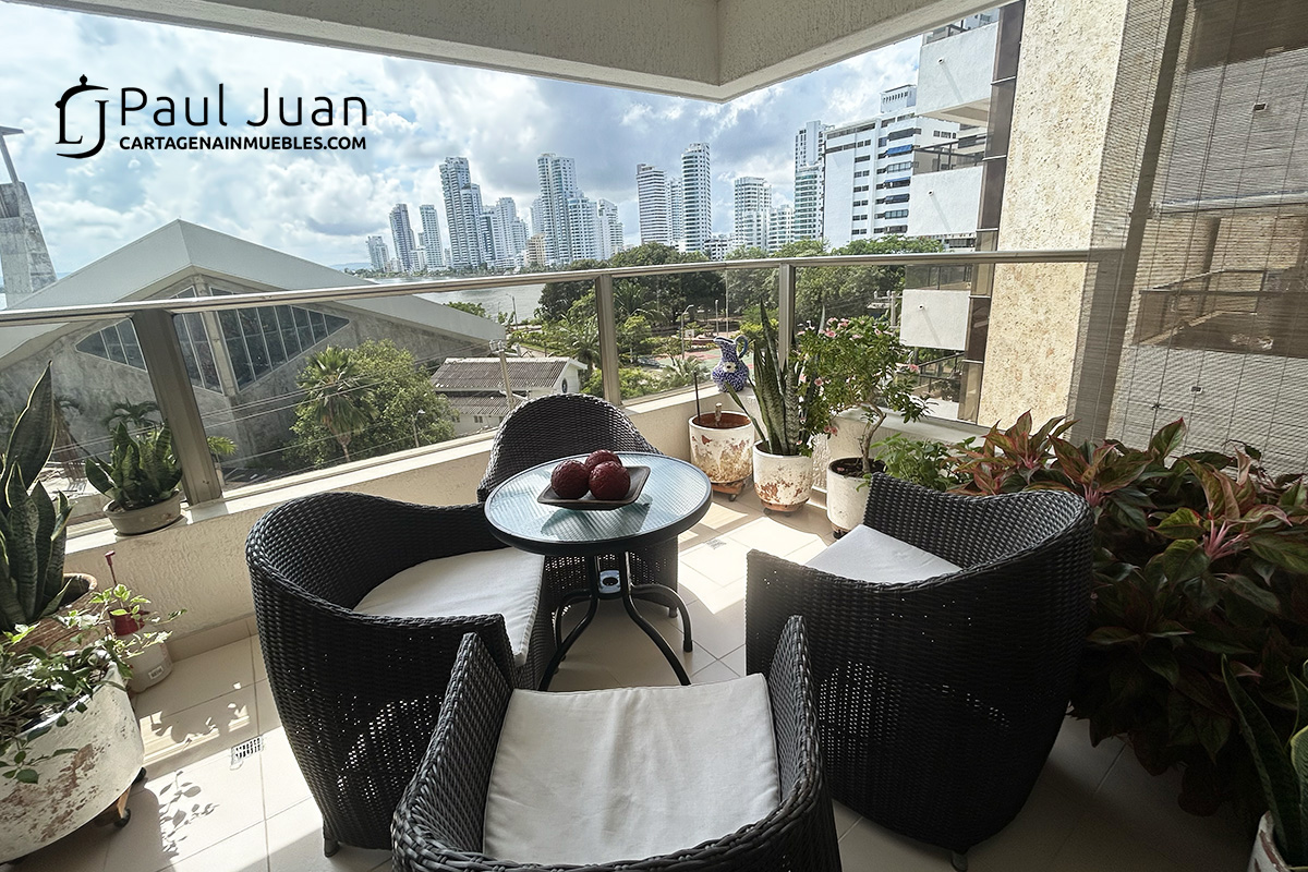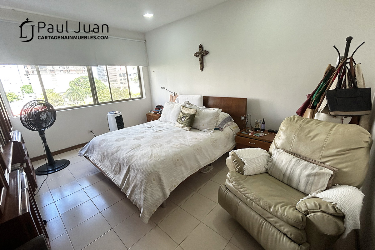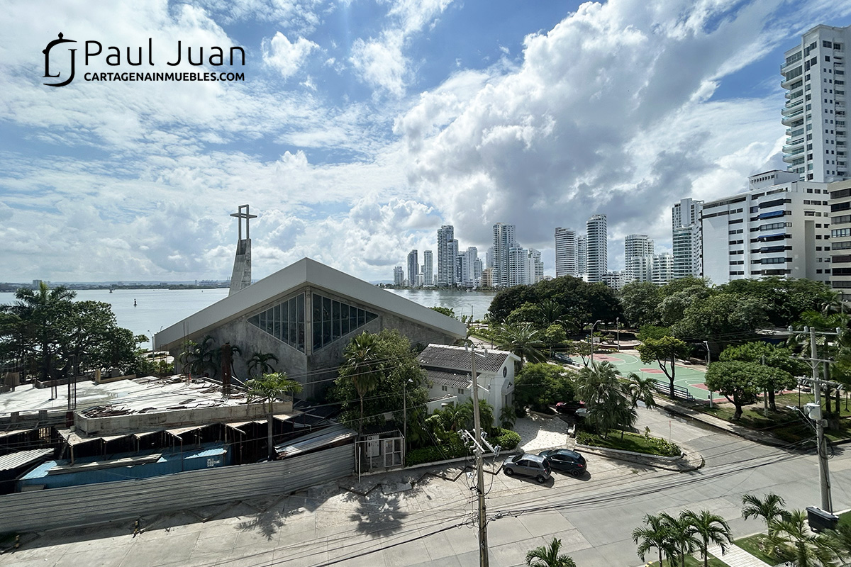 Bonito apartamento residencial, frente a la Iglesia de Bocagrande. Tiene sala, comedor, cocina, balcón, tres habitaciones dos baños y medio, zona de labores y cuarto y baño de servicio. Incluye dos garajes y un cuarto útil. Muebles no incluídos.