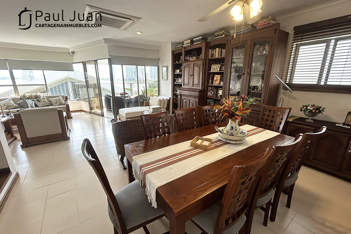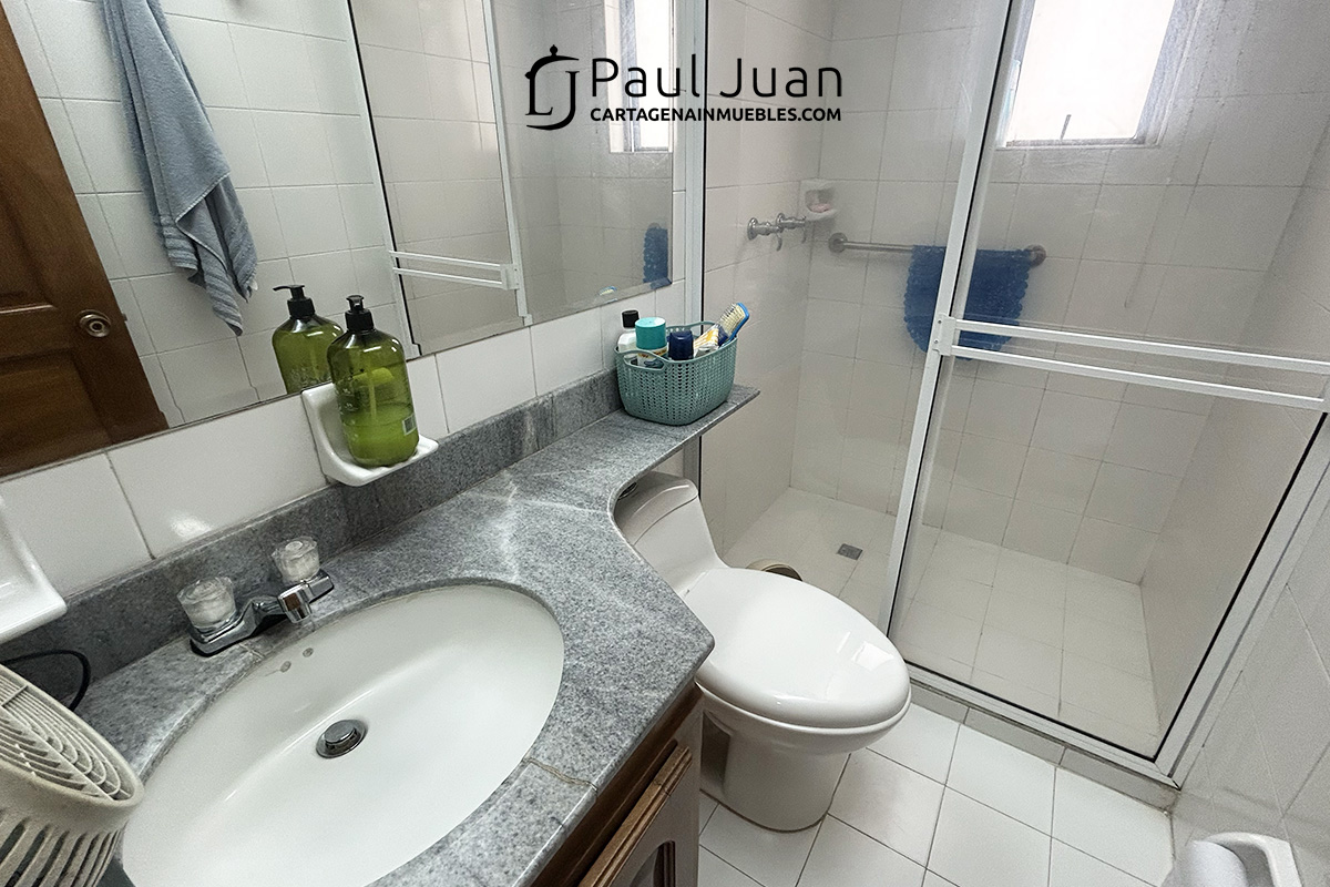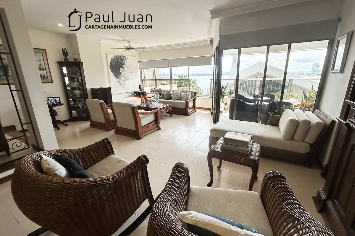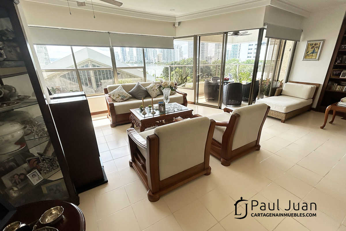 Bonito apartamento residencial, frente a la Iglesia de Bocagrande. Tiene sala, comedor, cocina, balcón, tres habitaciones dos baños y medio, zona de labores y cuarto y baño de servicio. Incluye dos garajes y un cuarto útil. Muebles no incluídos.
