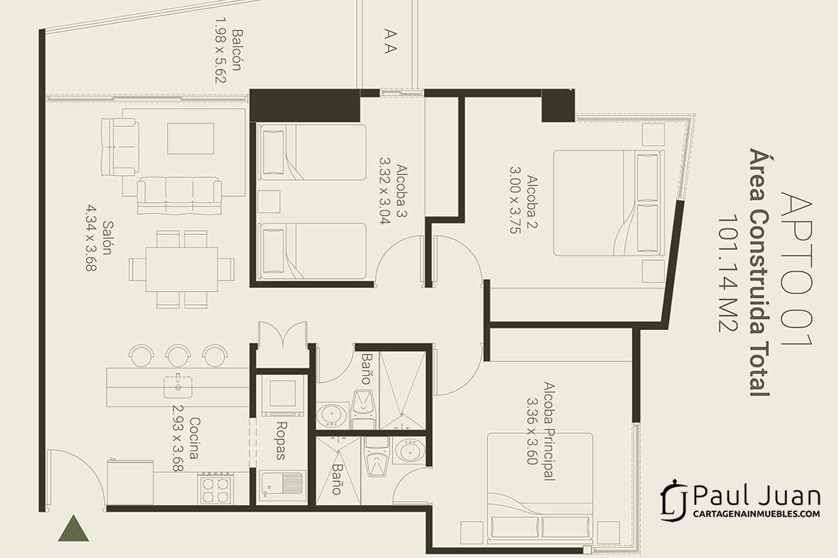 Bonito apartamento residencial nuevo para estrenar en venta. Tiene sala, comedor, cocina, balcón, tres habitaciones, dos baños, zona de labores y garaje.